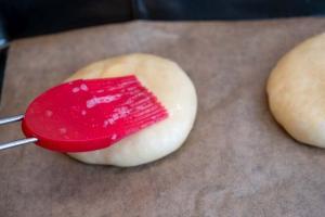 Verquirle ein weiteres Ei und bestreiche damit die geformten und plattgedrückten Buns.
